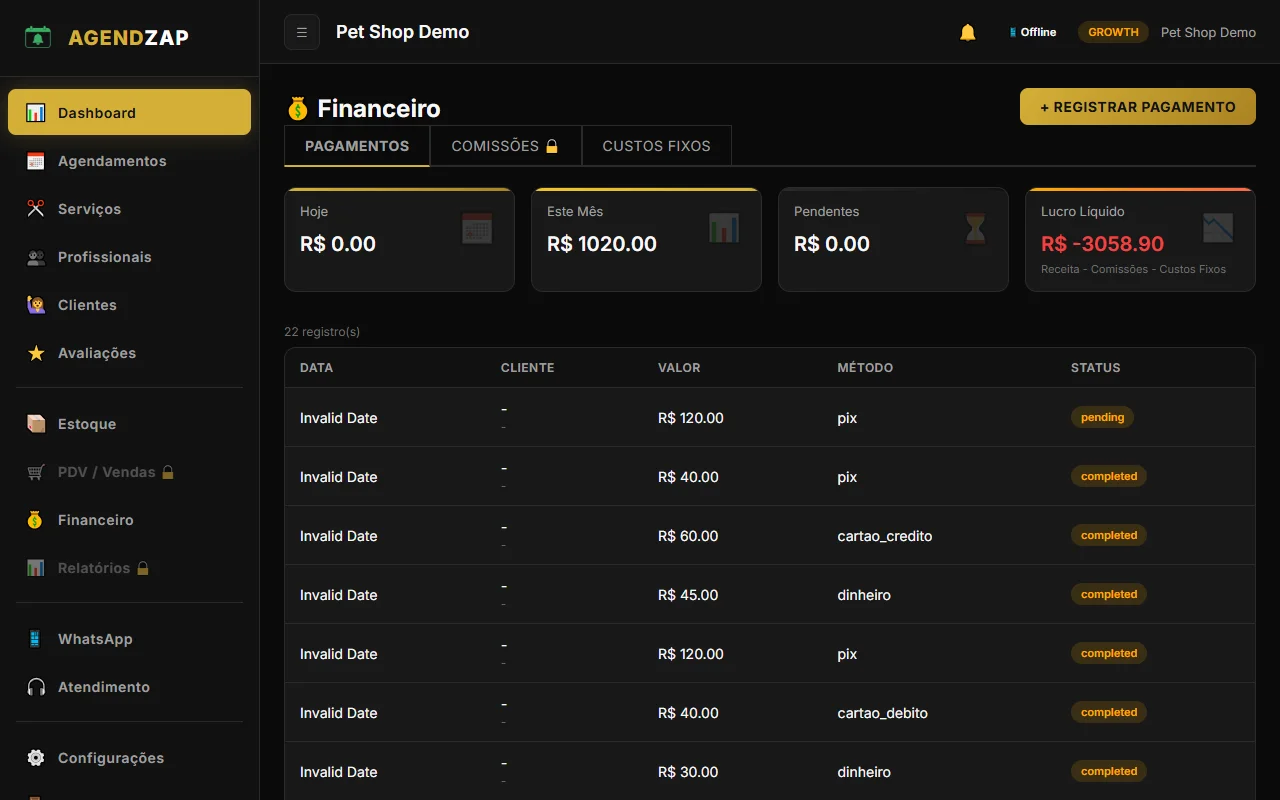 "Minha agenda vivia uma bagunça. Desde que coloquei o AgendZap, os tutores marcam sozinhos pelo WhatsApp e eu foco nos pets. Faturamento subiu 40% no primeiro mês."